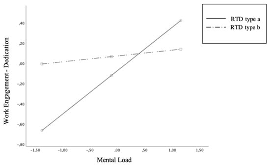 Having verified the existence of differences between the two samples, moderation hypotheses (H4) were tested. We investigated whether the interaction between the RTD type of contract and the resources variables could have effects on the work engagement dimensions. Given the absence of significant relationships of the work–life balance variable, this was excluded from the analysis. Furthermore, given the significant path that links mental load to work engagement, we considered Mental Load as a job resource, rather than a job demand. We therefore assessed the interactions of the RTD type of contract with Independence, Career Opportunities, and Mental Load. In the first step, the control variables (gender, years of tenure and type of RTD contract) were introduced. We added job resources as independent variables in the second step. Finally, we added the interaction terms in the third step. As shown in Table 3, the only statistically significant interaction was found in the relationship between Mental Load and Dedication, which showed higher values in the RTDa working situation. H4 was only partially confirmed. The moderation is shown graphically in Figure 3.