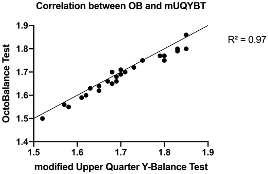 Therefore, the coefficient of correlation R2 = 0.97 shows the real validity of OB, indicating a high probability that the same result is obtained using OB and mUQYBT, which demonstrates the predictive value of the test as well as the relationship between both assessment tools since R2 = 1 is a perfect linear adjustment [14]. Therefore, our results were similar to those of Cramer et al. [12], which showed correlations of R2 = 0.96 between the mUQYBT and UQYBT. Thus, the results in the mUQYBT and the OB show the efficiency of the assessment of the articular range of motion to observe imbalance or limitations as possible risk factors or predispositions to suffer future injuries [6,7]; therefore, the use of these tools and assessments is essential.