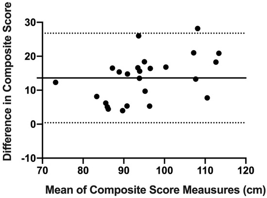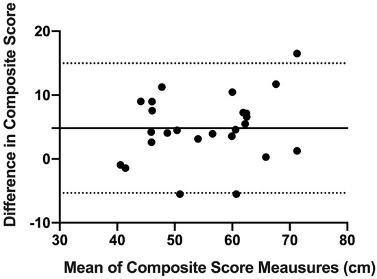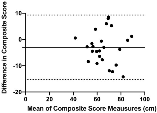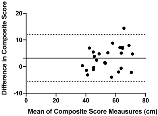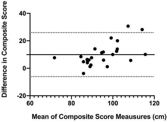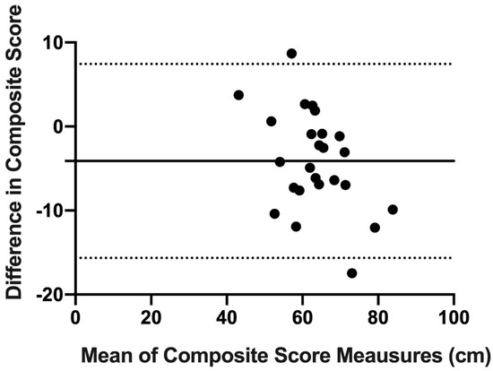 Likewise, the reproducibility of OB is shown in the minimal differences of the results in comparing week 1 and week 2 (56.45 ± 19.74 vs. 56.14 ± 17.87); such monitoring is essential for assisting athletes in knowing their evolution or progress and establishing at the same time a bond with their trainer or sports scientist in order to reduce the risk of injury [4]. The results also show the reproducibility of mUQYBT (81.63 ± 23.57 cm vs. 77.90 ± 22.92 cm) in week 1 and week 2.