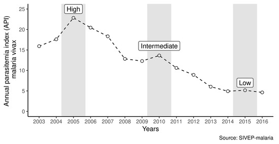 Annual parasitemia index (vivax malaria) during the period from 2003 to 2016 in the Brazilian Amazon.
