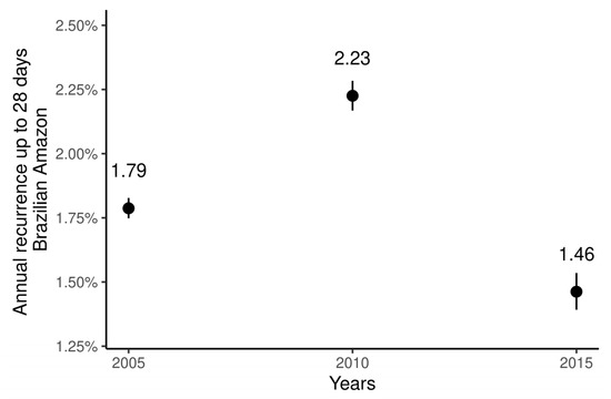Proportion of short-time recurrences in the Brazilian Amazon in 2005, 2010, and 2015. Bars represent 95% confidence intervals.