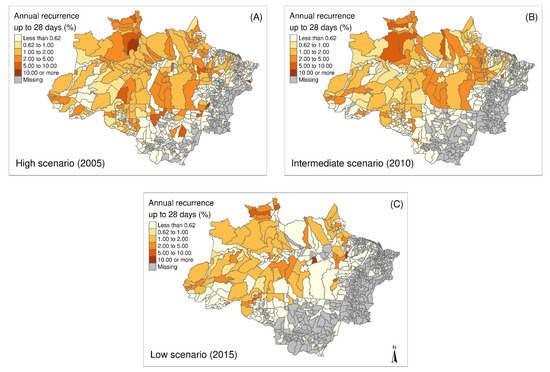 Spatial distribution of percentages of recurrence up to 28 days at the level of municipalities in the Brazilian Amazon in (A) 2005–High transmission scenario, (B) 2010–Intermediate transmission scenario, and (C) 2015–Low transmission scenario.
