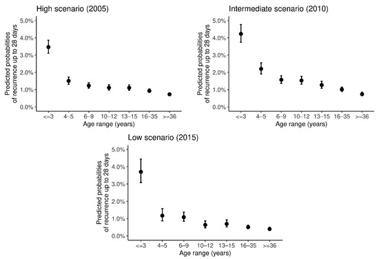 The predicted probability of recurrence up to 28 days in ages under four years old is above 3% and below 5%. For this age group, the confidence intervals present intersections between them across the studied years. For the range of 4 to 5-year-olds, and subsequent ages, the probabilities are smaller, and confidence intervals are non-overlapping with that for below four years old. This difference becomes more evident in the year 2010 (Figure 4).