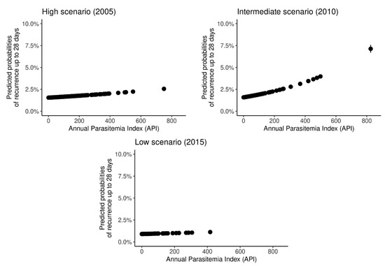 Predicted probability of recurrence up to 28 days according to the annual parasitemia index (API) in the Brazilian Amazon in 2005, 2010, and 2015.