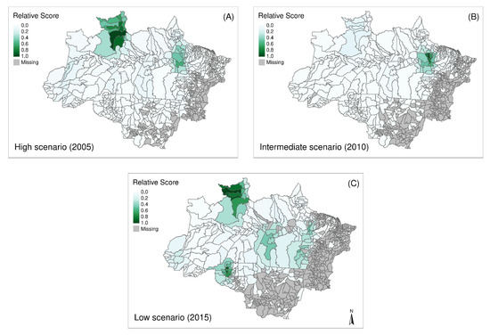 Spatial distribution and detection of clusters of recurrences up to 28 days in municipalities in the Amazon in (A) 2005–High transmission scenario, (B) 2010–Intermediate transmission scenario, and (C) 2015–Low transmission scenario.