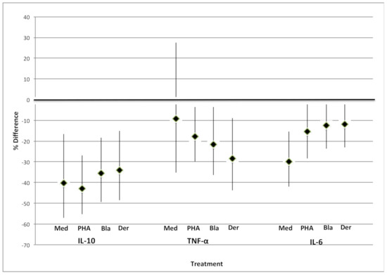 Cytokines: The cytokine panel includes major pro-inflammatory (TNF-α and IL-6) and anti-inflammatory (IL-10) cytokines. CBMCs were incubated in triplicate [31], either unstimulated (media alone) or treated with one of three immune system stimulants (see below), and cultured for 72 h. Cell supernatants were analyzed for IL-6, IL-10, and TNF-α production using enzyme-linked immunosorbent assay (Endogen, Rockford, IL, USA), following the manufacturer’s protocol. Assay sensitivities were <3 pg/mL for IL-10 and <2 pg/mL for TNF-α. The percent of samples below the limit of detection varied from 0% to 14.5%.