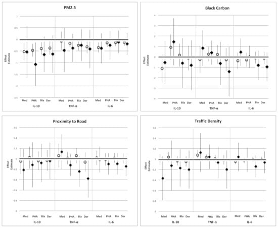 Considering effects of each type of air pollution on cytokine concentrations, findings were strongest for PM2.5 (Figure 1). PM2.5 exposure averaged over pregnancy showed robust inverse associations with all cytokines (unstimulated and stimulated). For example, in cells stimulated with Bla g 2, IL-10 decreased by 36% (95% CI = −49%, −18%) per 1 μg/m3 increase in PM2.5 and IL-6 decreased 13% (95% CI = −24%, 0.2%). All associations were statistically significant at p < 0.10 except for unstimulated levels of TNF-α. Associations for other air pollution measures, including proximity to a roadway, traffic density, and BC, were inconsistent across stimulants, often close to null and mostly non-significant (Figure S3).