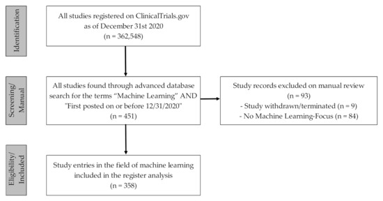 In view of the research question, the “advanced search function” was used to filter the register data records for which “Machine Learning” (a MeSH term introduced in 2016, [12]) had been entered in the report form and which were published by the end of 2020 (search term: “Machine Learning”|First posted on or before 31 December 2020). The dataset was retrieved on 7 January 2021 and exported in CSV file format [36]. In a second step, the authors scanned the dataset and included all study entries that clearly focused on the use or testing of ML-based algorithms, approaches or applications in a clinical setting. Entries on clinical trials that, according to the reporting party, were “withdrawn” or “terminated” or clearly did not primarily focus on the use of ML-related approaches or applications in clinical care were excluded from the study. In order to be able to filter and subgroup the studies in detail, the authors scanned the free text information of the study entries. Figure 1 shows the methodical procedure for the selection process of the study dataset considered for the register data analysis in the form of a flowchart.