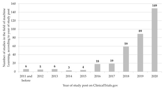 - Based on an analysis of data from the registry platform ClinicalTrials.gov, we show that the number of registered clinical studies in the field of ML has continuously increased from year to year since 2015, with a particularly significant increase in the last two years.