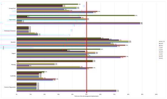 Observation was undertaken on the implementation of the bio-risk management systems in 11 laboratories in University Y. The fulfilment was calculated as a percentage by involving seven clauses, namely organizational context, leadership, planning, support, operations, performance evaluation and improvement. Overall, of the 11 laboratories examined, only 2 of them had a score higher than 50%. Lab A and B obtained the highest scores, which were cited at 55% and 58%, respectively, while other laboratories had scores ranging from 33% to 44% (Figure 1). More details for each clause are described in Table 1. According to surveys, sub-clauses where no evidence of implementation was identified were highlighted in red.