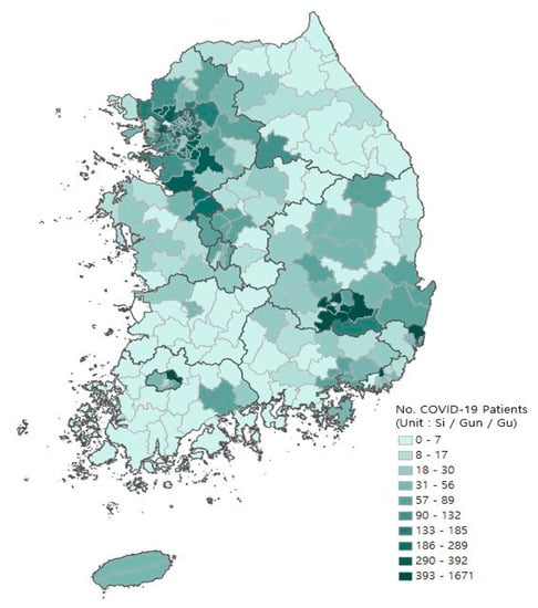 Our study area was the entire country of South Korea to empirically identify the main causes of the spatial proliferation of COVID-19. In response to the COVID-19 outbreak, the Korean government has adopted a stringent contact-tracing strategy, called the 3T framework (Testing-Tracing-Treatment), to control and reduce the number of COVID-19 cases []. Because of the effective control strategies and low infection rates, the Korean government has not imposed any national lockdown policies commonly adopted in the U.S. and most European countries []. Soon after the COVID-19 outbreak in Korea, the health officials swiftly installed drive- and walk-through testing facilities, adopted extensive movement- and contract-tracing strategies, and communicated movement trajectories of confirmed patients via online maps and automatic mobile phone alert systems [,]. Most Korean citizens actively followed the quarantine guidelines, such as mask-wearing and hand-washing, while voluntarily practicing strong social distance measures in high-incidence areas as a self-protection measure.