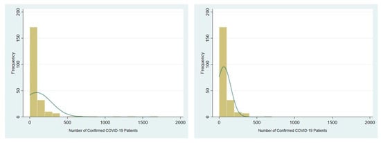 To estimate the numbers of COVID-19 cases over the study period, we developed a robust ordinary least squares (OLS) regression model and a robust negative binomial regression (NBR) model. The probability of being diagnosed with COVID-19 exhibits the same probability distribution of a coincidental event. In such a case, a Poisson regression model or a robust negative binomial model are more appropriate to use than a standard OLS model []. When using the Poisson regression model, the underlying assumption is that the mean and the variance of an event occurring are identical to each other. Hence, if the actual analysis of the data shows over-dispersion, then there are obvious limitations to using this model. As such, when looking at the means and the variances of the two dependent variables used in this study, we found that the Poisson model was not suitable. Over-dispersion was detected in the means of the total number of confirmed cases and cases per 10,000 (91.17 and 3.55, respectively) as well as their variances (28,435.98 and 66.51, respectively). Also, not many cases of zero-patients were observed in our data; therefore, it was more suitable to use a robust negative binomial model than a zero-inflated Poisson model []. Moreover, we chose to use the robust model to minimize the impact of heteroskedasticity.