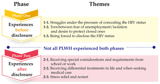 Analysis of the participants’ experiences of HIV status disclosure resulted in two phases and six themes (Figure 1). Not all PLWH experienced both phases (experiences before disclosure, experiences after disclosure). Some participants never disclosed their HIV status.