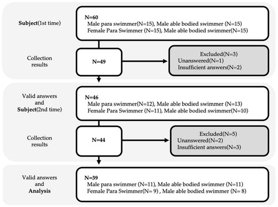 The flowchart of the survey is shown in Figure 1. Forty-nine people responded to the first questionnaire, of which three were excluded, and hence, 46 (76.7%) participants were included. The second questionnaire was administered to the 46 valid respondents of the first questionnaire, and we received 44 responses, of which five were excluded, and 39 were finally included in the analysis. Of these, 11 (28.2%) were male para-swimmers, nine (23.0%) were female para-swimmers, 11 (28.2%) were male able-bodied swimmers, and eight (20.5%) were female able-bodied swimmers. Those who were excluded had inadequate or inappropriate scores.