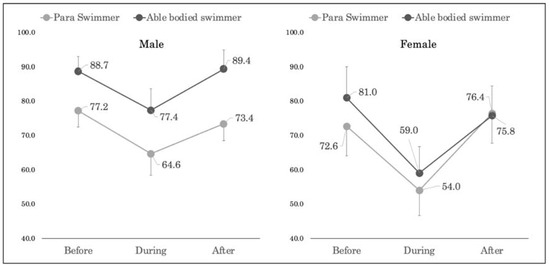 The present study showed that COVID-19-induced changes in living conditions resulted in decreased apathy in able-bodied swimmers and para-swimmers, but the effects were particularly significant in women with disabilities. Para-swimmers may not be able to perform aerobic exercise on land, which can be substituted for swimming, and are also limited in what they can do at home. Therefore, it is important to promote the management of sports venues at the local level [34], create alternative opportunities to exercise by planning exercises that can be performed on the spot, regardless of location or situation, and consider psychological health from the aspect of gender and disability.