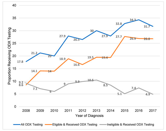- Kozick, Z.; Hashmi, A.; Dove, J.; Hunsinger, M.; Arora, T.; Wild, J.; Shabahang, M.; Blansfield, J. Disparities in compliance with the Oncotype DX breast cancer test in the United States: A National Cancer Data Base assessment. Am. J. Surg. 2018, 215, 686–692. [Google Scholar] [CrossRef] [PubMed]