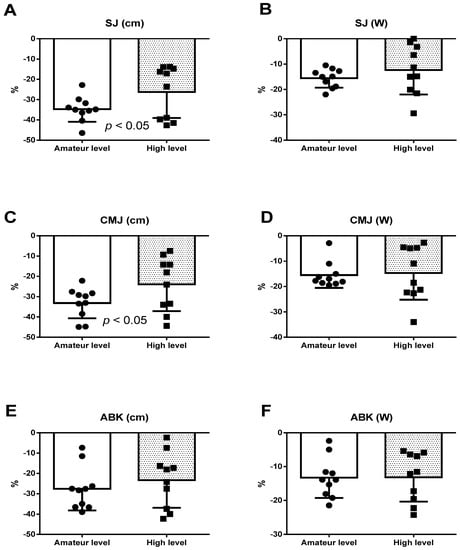 | Parameters | Amateur Level (n = 10) | High Level (n = 10) | p |