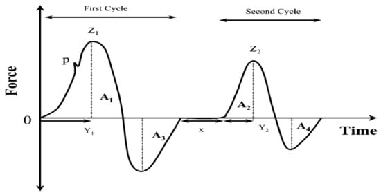 A widely used imitative test today in the food technology field is the so-called Texture Profile Analysis (TPA). The TPA is not only widespread, but also convenient for rapid food texture evaluations [33], although texture can be measured by expert people with sensorial analyses. This test involves double compression to determine food textural properties. Any food texture identity is rarely a simple matter of understanding a singular characteristic, such as toughness or cohesion. The texture of each food is versatile and related to consumers’ sensory expectations. It is not enough to deliver food with the target hardness and elasticity if consumers do not like it and it does not meet their expectations for that food type [34].