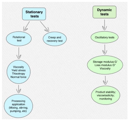 The rheometer, or viscometer, measures resistance to flow when a known force or stress is produced by a known amount of flow, and is crucial equipment in food rheological studies. Such equipment can be capillary viscometers, falling-ball viscometers, and rotational and oscillatory rheometers, which are used to take rheological measurements [54]. Tests must be carried out under certain conditions for samples, such as steady flow, laminar flow, and uniform temperature [60]. Figure 2 shows the different tests used in rheology.