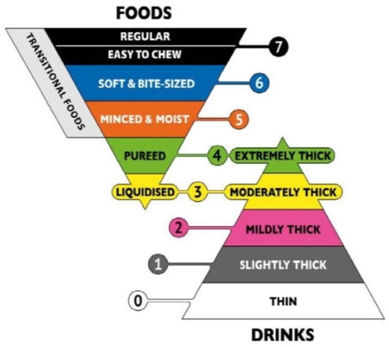 The IDDSI Framework for the TM food and thickened liquids used with dysphagic individuals from all age groups, in all healthcare facilities and of all cultures [122]. Note. 0: thin; 1: slightly thick; 2: slightly thick; 3: liquidized/moderately thick; 4: puréed/extremely thick; 5: minced and moist; 6: soft and bite-sized; 7: easy to chew/regular.