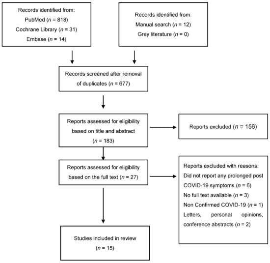 The inclusion criteria consisted of clinical studies on post-COVID-19 prolonged symptoms. Clinical trials, observational studies (cohorts, cross-sectional, case-control) and case reports were considered.