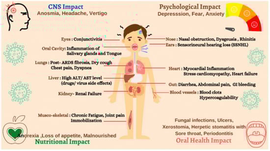 The case study on otolaryngologic assessment also evidenced nasal obstruction, rhinitis, anosmia, dysgeusia, vertigo, and sudden-onset sensorineural hearing loss (SSNHL) among middle-aged and elderly patients []. The COVID-19 infection manifested ocular symptoms such as conjunctivitis, red eyes, swelling of the conjunctiva, overflow of tears onto the face, inflammations and impairment of retinal vascularization []. Further, the authors associated the hematological abnormalities, such as increased levels of white blood cells (WBCs) and neutrophils, with COVID-19 patients having ocular symptoms. Additionally, there have been several reports on adverse oral health outcomes, likely leading to various opportunistic fungal infections, such as COVID-19-associated mucor mycosis (CAMCR), hyposalivation causing xerostomia, ulcerations, and HSV-1 due to COVID therapeutic interventions. A summary of these prolonged post-COVID-19 symptoms is illustrated in Figure 2.