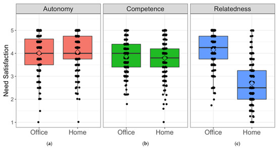 Comparing the basic needs’ fulfilment before the pandemic, i.e., when still working primarily in the office vs. when working from home, showing (a) autonomy stays on average the same, (b) competence stays on average the same, (c) relatedness is substantially lowered when working from home. Boxplots represent the range of the values, with vertical lines indicating the respective standard deviation. Horizontal lines within the boxplots illustrate the arithmetic mean, and diamonds represent the median.