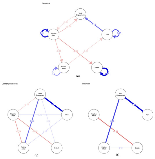 Results of the temporal network analysis of the daily variables work engagement, flow, detachment from work, positive affect and negative affect. Blue lines represent positive associations; red lines negative associations. (a) The estimated temporal network, standardized to partial directed correlations, and the edges with arrow indicate how one variable on day n predicts the other on day n + 1; (b) the estimated contemporaneous partial correlation network, and the edges indicate association between two variables on the same day; (c) the estimated between-subjects partial correlation network, and the edges indicate cross-subject association among the daily variables.