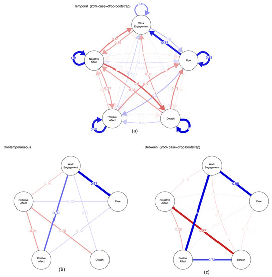 In the current model, we used daily measures of work engagement, flow, detachment, positive affect, and negative affect. Drawing from the same underlying statistical model, we estimated three types of networks: temporal, contemporaneous, and between-persons. We estimated the stability of the network model by performing 1000 times 25% case-drop bootstraps [23]. The level of stability is indicated by the number of times that each edge is included in the 1000 bootstrap samples (see Table A1 and Table A2).