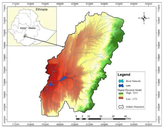 In central Ethiopia, the main Ethiopian Rift divides the Ethiopian highlands into northeastern and southwestern halves. This rift includes the Ethiopian Rift Valley lakes which occupy the floor of the rift valley, with different sub-watersheds. The Gidabo watershed is located between latitude 6°9′′4″ and 6°56′′4″ N, and longitude 37°55′ and 38°35″ E (Figure 1). It has a peak of 3213 m.a.s.l. and the lowest altitude is about 1171 m.a.s.l.