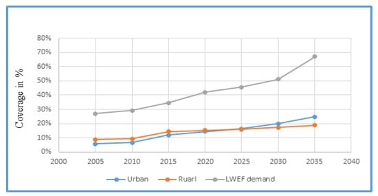 The demographic development and characteristics in the study area have implications for the high demand on the existing patterns of land, water, energy and food availability, and strongly driven nexus resource potential. The rural and urban population in the study area increased from 2005 to 2020, and is also expected to increase up to 2035 with increasing demand for nexus resources (Figure 5). This population growth may also increase the levels of poverty, which results in the unwise use of land, water, energy and food.