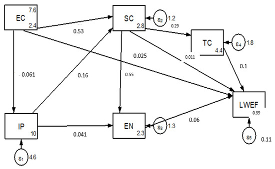 Regarding low capital (EC2), it has both direct (p = 0.12) and negative indirect (p = −0.003) impacts on LWEF nexus resources (Figure 6). This necessitates that governments set capital to stimulate economic activity to meet particular sectorial development goals. For low capital, the characteristics of low economic potential have taken the brunt of the blame by causing the unsustainable use of nexus resources, which is caused by low investment. These economic activities have greater risk for people who are dependent on the natural resource sector; agricultural workers, pastoral and forest communities, and those experiencing multiple forms of inequality, marginalization and poverty are most exposed to the impacts.