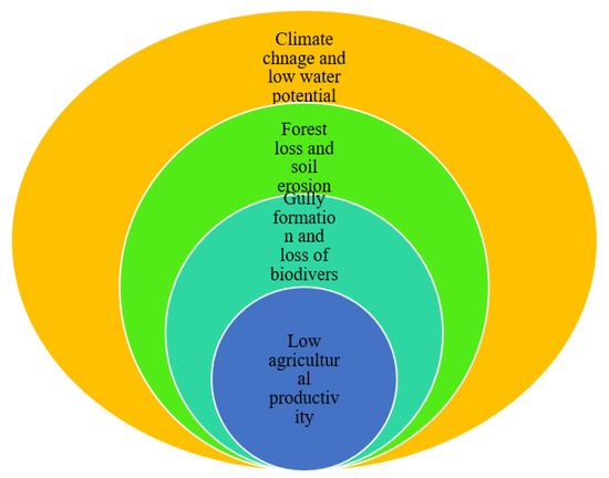 There has been a growing demand for land, water, energy and food (LWEF) nexus resources in the past half-century due to increasing population growth, urbanization, and unplanned consumption [1,2]. This has pushed more than one billion people to face shortages of land, water, energy and food. The risk of nexus resources insecurity impacts results from the interaction of natural and anthropogenic factors which lead to the vulnerability and exposure of the human and natural system that substantially contributes to nexus resource degradation [3]. This diminishes the capacity of the nexus resources that perform essential functions and services in the ecosystem [4,5].