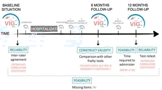 This is an observational study, based on the classical test theory [] and conducted in the prospective FIS/VIG cohort designed for the validation of the Frail-VIG index and the dynamic assessment of frailty over time. Participant recruitment was performed at an intermediate care hospital, with a home-based follow-up of 12 months and quarterly assessments of the degree of frailty by means of the Frail-VIG index.