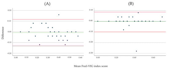 The reliability of the Frail-VIG index scores can be classified as very strong. There are virtually no previous studies on the reliability of FI [], which makes it difficult to compare the results obtained. With respect to other frailty instruments, the Frail-VIG index showed better inter-rater reliability (0.94) than, for example, the Edmonton Frail Scale (0.77) [] or the CFS (from 0.97 [] to 0.68 []).