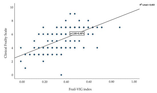 Lastly, the degree of correlation between the two instruments that assess frailty as a continuous reality, Frail-VIG index and CFS (r = 0.66), was similar to previous studies for these two instruments (r = 0.71) []. This is consistent with published evidence on convergent validity between CFS and other FIs, ranging from 0.59 of the electronic frailty index [] to 0.91 of the FI used by Chong et al. [].