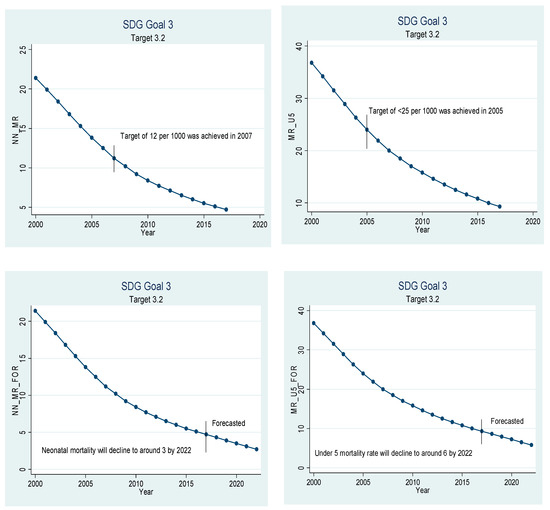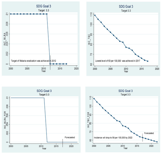 Figure 3 is about target 3.3, which states that the countries should end epidemics such as tuberculosis, malaria, and neglected tropical diseases by the year 2030. China has almost succeeded in eliminating malaria and tuberculosis. The incidence of malaria was recorded to be 0.000 patients per 1000 in 2017, and the incidence of tuberculosis was recorded to be only 63 per 100,000 population in 2017. If the current trend continues, malaria will be eliminated by 2022, and only 58 people out of 100,000 are expected to have TB in 2022. The results related to the incidence of tuberculosis seem to contradict the findings of [36] but it is not so. Our findings suggest that tuberculosis will still exist in the future and its incidence rate will be 0.058%, which is low enough to be neglected. The difference between our study and theirs is that their study only focuses on tuberculosis but ours is broader in context as we have studied the healthcare sector as a whole and not only a single disease.