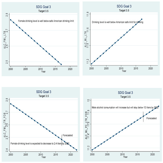 Figure 5 relates to target 3.5, which states that nations should strengthen the prevention and treatment of narcotics use and the harmful use of alcohol. One of the areas that need to be managed carefully in China is alcohol consumption. Pure alcohol consumption in China is on the rise. Each person in China drank 7.22 L of pure alcohol on average in 2017, and pure alcohol consumption has recorded an upward trend. Careful analysis of the numbers reveals that male and female sections of society are behaving totally differently. Alcohol consumption by females is on the decline, and alcohol consumption by males is surging at a very high rate. Females only drank 2.48 L of pure alcohol in the year 2017, while the males drank 11.73 L on average in 2017. Our results still validate the findings of [38] that males’ alcohol consumption is many times more than females’ consumption. If the current trend continues, females are expected to drink only 2.4 L of pure alcohol in the year 2022. On the other hand, males expected to drink 11.9 L on average; i.e., males will be touching the binge-drinking level by 2022. The binge-drinking level of 6.49 L per year for females and 12.98 L for males is calculated based on standards set by the National Institute on Alcohol Abuse and Alcoholism. This finding supports the results of [39] that the production and consumption of alcohol in China has increased manyfold. Therefore, the government should take measures to encourage the male population to drink alcohol within their limits. Otherwise, the harmful use of alcohol will lead to medical, social, and legal problems.