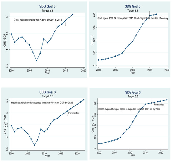 Beta coefficients of the variables given in Table 5 have been used for extrapolation to forecast. The graphical depiction of the performance of the Chinese healthcare sector and its comparison with the SDGs is presented in Figure 1, Figure 2, Figure 3, Figure 4, Figure 5, Figure 6 and Figure 7. All the figures provide ex-post and ex-ante information. The ex-post period ranges from 2000 to 2017, and the ex-ante period is from 2018 to 2022. There are 17 SDGs, and goal 3 is about ‘Good Health and Well-Being’. Like all other goals, goal 3 also has some targets that the participating nations should achieve before 2030 to make this planet a healthy place. Every figure provides information about the target and how the Chinese healthcare sector has performed against that target.