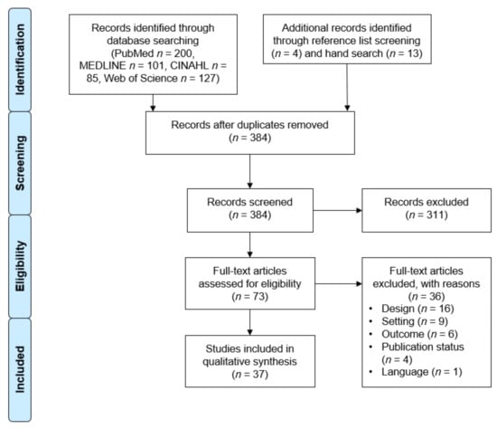 PRISMA Flow Diagram for the selection process of systematic reviews, following Moher et al. [37].