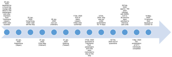 Several authors [32,39,40,41,42,43,44,45,46,47,48,49,51,52,53,54,55,56,57,58,59,60,61,62,63,64,65] described that the Diamond Princess departed from Yokohama on 20 January 2020 for a 16-day journey including destinations in Japan, Hong Kong, Vietnam, and Taiwan, accommodating about 3700 passengers and crew members (Figure 2). However, it was reported that an 80-year-old passenger who disembarked in Hong Kong on 25 January 2020 was presented with mild dry cough two days earlier (23 January 2020) [32,40,41,42,43,44,46,47,48,49,52,55,56,58,60,61,62,63,64,65]. Confirmed positive test results for SARS-CoV-2 for this index case were available on 1 February followed by the first 10 people diagnosed with a SARS-CoV-2 infection in the subsequent two to four days depending on the reference [32,40,41,43,44,46,47,48,49,51,54,55,56,58,61,62,63,64]. Consequently, Japanese authorities put the Diamond Princess under quarantine for 14 days restraining passengers to their cabins whereby the passenger cabin capacity ranged from one to four persons [32,40,41,42,43,44,46,47,48,49,51,52,54,56,58,60,61,62,63,64,65]. Passengers were authorized to spend time on an external deck each day for 60 minutes on the condition to wear masks, keep the distance and not touch any surfaces. Hence, regular duties like food and cleaning services needed to be maintained during the quarantine by crew members, who were restricted to remain in their cabins when having COVID-19 specific symptoms [32,41,42,44,46,47,48,49,56,58,65]. Additionally, on 7 February, thermometers were distributed asking the passengers and crew members to monitor their own temperature multiple times a day calling a “Fever Call Centre” in case of abnormalities. After informing the hotline, members of the Japan’s disaster medical assistance team (DMAT) and Ministry of Defence visited passengers for an examination of their health condition and if necessary, oropharyngeal swabs were taken from suspected cases [46,48,49,50].