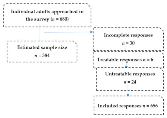 Data extraction is a crucial step in the research process and involves careful examination of completed and incompletely answered questionnaires []. For the current study, the data were checked for accuracy and completeness. Missing responses, incomplete responses, and invalid responses were excluded from the study, as shown in Figure 1.