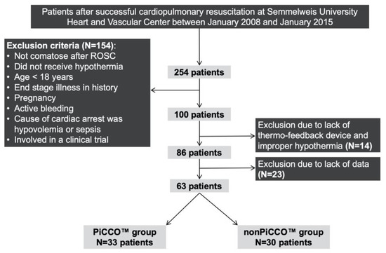 We included in our analysis those comatose patients who were cooled to 32–34 °C for 24 h after ROSC on the basis of the actual ERC (European Resuscitation Council) guidelines [19], were older than 18 years, had no end-stage illness in history, were not pregnant, had no active bleeding, whose cause of cardiac arrest had a probable cardiac origin, and were not involved in a clinical trial. In addition, only patients cooled with the Blanketrol III™ (Cincinatti SubZero Products, Cincinatti, USA) thermo-feedback device were enrolled into the study—those patients whose temperature management was applied with ice packs and/or physical cooling were excluded because target temperatures could not be reached in most of these cases. Twenty-three patients were excluded from the study due to lack of data. After the sampling process depicted in Figure 1, the final study sample included 63 patients (33 who received and 30 who did not receive PiCCO™ monitoring).