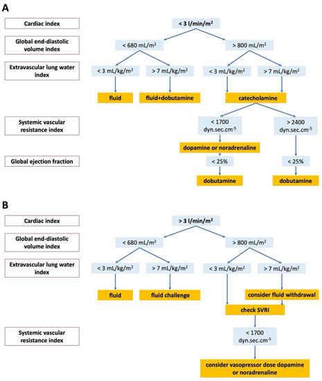 Fluid, vasopressor, and inotrope therapy were accomplished by monitoring heart rate (HR), mean arterial pressure (MAP), central venous pressure, diuresis, and lactate levels for patients without PiCCO™. We used the goal parameters given by the actual ERC guidelines [20]. Dopamine at a vasopressor dose or noradrenaline were administered as vasopressors after fluid challenge if MAP was still lower than 65 mmHg or diuresis fell below 1 mL/kg/hour. Fluid challenge was administered even in the case of elevated lactate level referring to low perfusion of the peripheral tissues. Dobutamine was used if positive inotropic agent was required based on the echocardiography at admission. The hemodynamic management was guided by PiCCO™ parameters and the principles of therapy decision tree of Pulsion Medical System [21] were applied for PiCCO™ patients. Figure 2A,B show the detailed hemodynamic management of PiCCO™ monitored patients.
