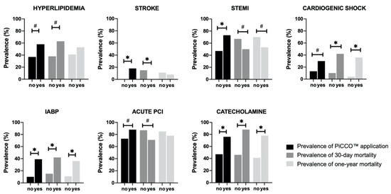 Comparison of PiCCO use, 30 day mortality, and 1 year mortality by patient condition characteristics. Chi-square test was performed. ∗: p < 0.05; #: p < 0.2; PiCCO: pulse index contour cardiac output; IABP: intra-aortic balloon pump; PCI: percutaneous coronary intervention; and STEMI: ST-elevation myocardial infarction.