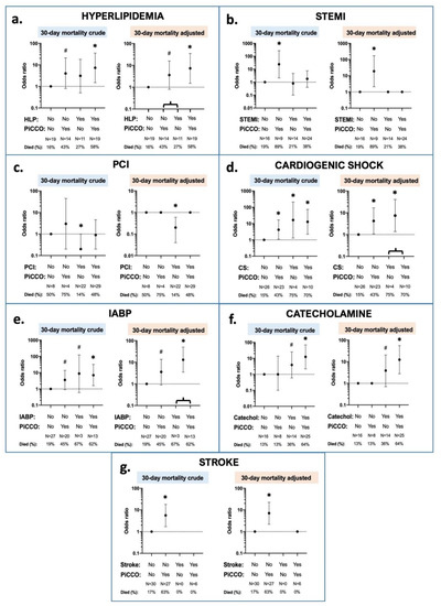 Interaction effects between PiCCO™-application, 30 day mortality, and patient condition characteristics. Patient conditions are depicted in the different subfigures; (a) hyperlipidemia; (b) STEMI at admission; (c): PCI treatment; (d): cardiogenic shock at admission; (e): IABP insertion; (f): catecholamine administration; (g): stroke in the prior history. Crude and adjusted logistic regressions were performed. In the crude models, all the interaction term dummy variables were included as separate variables. In the adjusted models, non-significant dummies were combined. ∗: p < 0.05; #: p < 0.2; catechol: catecholamine; CS: cardiogenic shock; HLP: hyperlipidemia; IABP: intra-aortic balloon pump; N: number of patients; PCI: percutaneous coronary intervention; PiCCO: pulse index contour cardiac output; and STEMI: ST-elevation myocardial infarction.