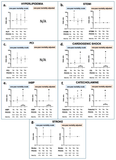 Interaction effects between PiCCO™-application, 1 year mortality, and patient condition characteristics. Patient conditions are depicted in the different subfigures; (a) hyperlipidemia; (b) STEMI at admission; (c): PCI treatment; (d): cardiogenic shock at admission; (e): IABP insertion; (f): catecholamine administration; (g): stroke in the prior history. Crude and adjusted logistic regressions were performed. In the crude models, all the interaction term dummy variables were included as separate variables. In the adjusted models, non-significant dummies were combined. ∗: p < 0.05; #: p < 0.2; catechol: catecholamine; CS: cardiogenic shock; HLP: hyperlipidemia; IABP: intra-aortic balloon pump; N: number of patients; PCI: percutaneous coronary intervention; PiCCO: pulse index contour cardiac output; and STEMI: ST-elevation myocardial infarction.