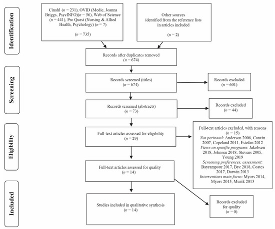 We did not set a time limit in the original search: our idea had been to include wide ranges of mental health questions around PPD, including dual disorders and substance-related questions, yet we removed early entries from our search terms, and as such articles were scarce. By the stage of reading the full texts, we identified studies outside the perinatal period and excluded studies that described single interventions, feasibility studies, screening tools, or perinatal services (programs). As cultural context impacts help-seeking and experiential stigma of mental illness [1,4,5,18,25], we focused solely on Western societies, and we acknowledged the differences, such as those in the healthcare systems in specific countries. EndNote online software (Clarivate Analytics, Philadelphia, PA, USA) was used to facilitate the process of choosing relevant references. The search and inclusion strategy are presented in Figure 1.