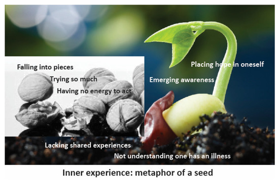 The metaphor of a seed represents an interpretation of the phase prior to seeking help. As seeds need to have suitable conditions for growth, help-seeking for PPD involves the inner unresolved individual experiences. Individual experiences manifest as a symbolic seed, at risk of being cracked into pieces by the surrounding circumstances and inner experiences. In describing the situation of women experiencing PPD, the metaphor of a symbolic seed also describes women’s own resources and possibilities. The solution lies within the women themselves, as emerging awareness and hope may co-exist or evolve. Each of the identified themes involves ambiguity and emotional turmoil—an unresolved life situation. Women try to solve the inner conflict through different means. They experience experiential turmoil as a metaphor of falling into pieces, and they may not have the words to express their needs. Since women may experience inner isolation and they do not have the strength or knowledge to seek help, they may not be able to seek help. Their solution may be to continue to solve the situation themselves, but they may not have the opportunities or strength to resolve the uncomfortable situation. This is why family and other loved ones play a crucial role along with HCPs.