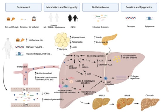 Complex interactions among environmental factors, metabolism and demography, genetic variants, and gut microbiota are involved in the pathogenesis of NAFLD []. Current understanding of the disease involves excessive hepatic accumulation of lipids resulting from an increased fatty acid input/output balance because of changes in the lifestyle associated with high energy uptake, sedentarism, and MS. The augmented free fatty acid uptake in the liver results from high energy diet, increased lipolysis of adipose tissue, and de novo hepatic lipogenesis, while output mechanisms related with fatty acid oxidation and very low-density lipoproteins secretion (VLDL) remain insufficient to compensate for the accumulation of triglycerides []. Saturated fatty acids in the liver induce lipotoxicity associated with increased endoplasmic reticulum stress [,] and lipid oxidation responses that increase the oxidative stress in the liver, a topic analyzed in depth by Bovi et al. []. In addition, poor diet in patients with NAFLD may contribute to changes in the microbiota related with low production of short chain fatty acids (SCFAs), increased intestinal permeability, and translocation of luminal bacteria or its products to the liver where they will foster an inflammatory environment. Consequently, hepatic stellate cells will activate and release collagen, contributing to fibrosis and progression of the disease. The contribution of all these factors can be followed in detail in Figure 1 and, together with the genetic and epigenetic background, will be the topics addressed in this review.